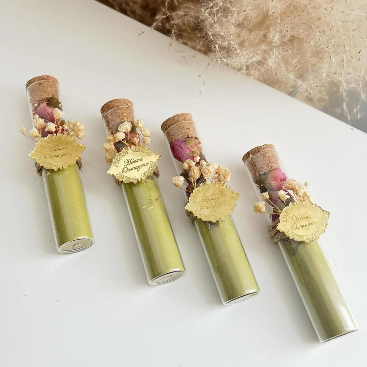 Veredeln Sie Ihre Feier mit diesem edlen Henna in Sanduhrform, dekoriert mit Trockenblumen und einem personalisierten Anhänger. Ein authentisches und traditionelles Gastgeschenk – ideal für Hochzeiten, Verlobungen und besondere Anlässe.