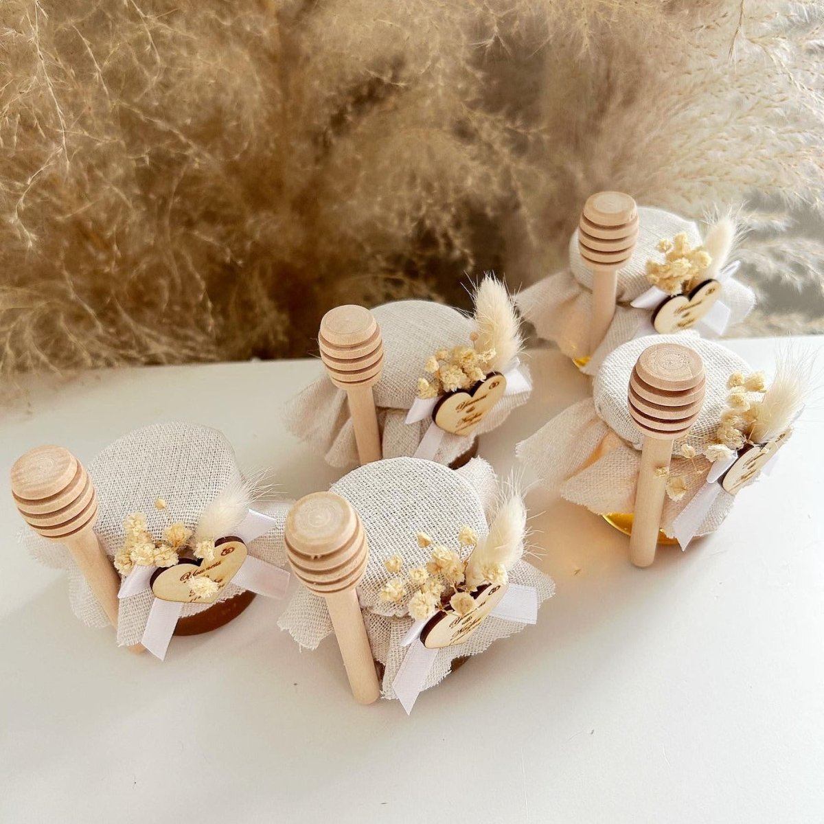 Schenken Sie Ihren Gästen ein süßes und elegantes Andenken mit diesem Honigglas – ideal als personalisiertes Gastgeschenk zur Hochzeit oder Taufe