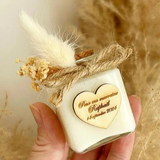 Verleihen Sie Ihrer Feier eine authentische, sanfte Note mit dieser Kerze mit herzförmiger Holzgravur – ein personalisiertes Gastgeschenk, ideal für Hochzeit, Kommunion, Taufe oder Geburtstag.